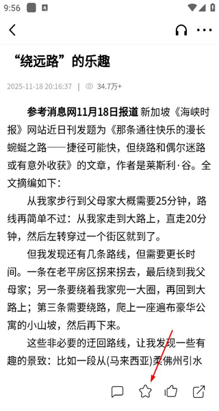 在“绕远路的乐趣”详情页,浏览新加坡相关的文章内容后,点击页面底部的收藏按钮,就能把这篇文章收藏起来,方便之后再查看。