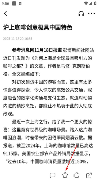 3、回到文章列表,找到并点击标题为“沪上咖啡创意极具中国特色”的文章,进入详情页面后即可查看上海咖啡的相关内容,还能对该文章进行收藏操作。