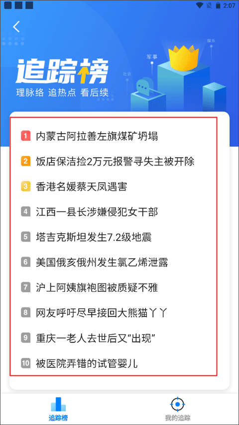4、如果想查看自己实时追踪的热点新闻后续,可以在【我的追踪】里面看。