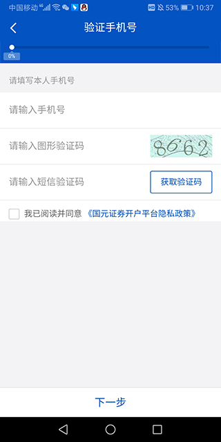接着输入手机号码与验证码完成验证,验证通过后就能进入开户流程,按照系统向导的提示操作就可以了。