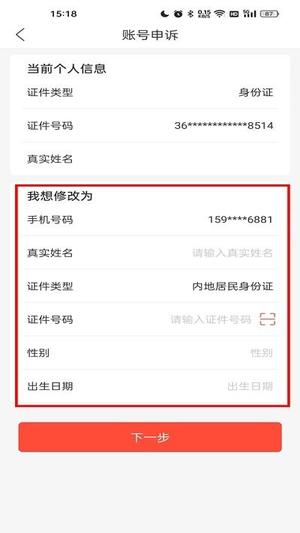 6、填写我想修改为的身份证信息,然后点击下一步根据身份认证流程,进行