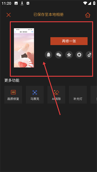 4、保存成功后,页面会显示【已保存至本地相册】的提示,您也可以点击【再修一张】按钮继续编辑新的图片素材。