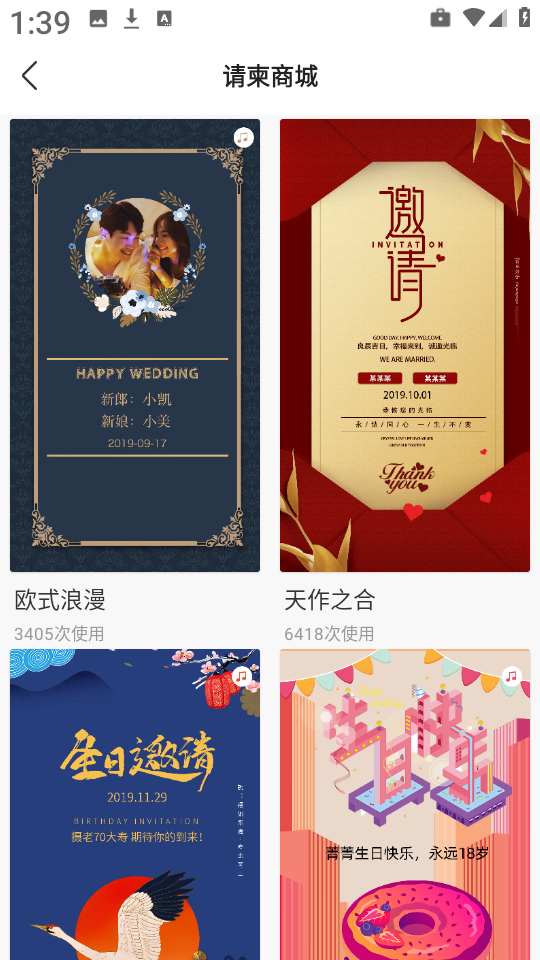 应用中提供了海量的请柬模板内容,用户可以对大量的模板进行筛选使用;