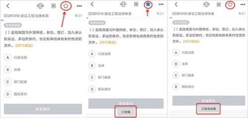 4、点击做题页面右上角的按钮,当按钮变为蓝色,且出现文字提示“已收藏“,则代表您已完成对该题的收藏;