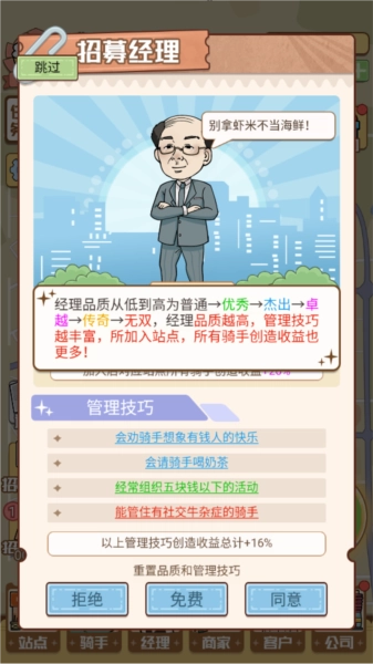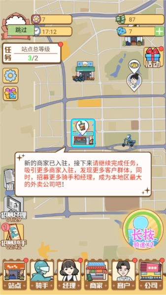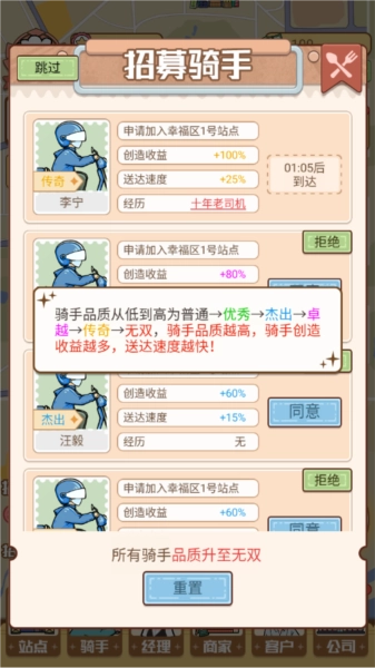 骑手品质升级:骑手品质从普通到无双共6级,品质越高,单次配送收益与速度越快。优先升级核心骑手,可提升整体金币产出效率。