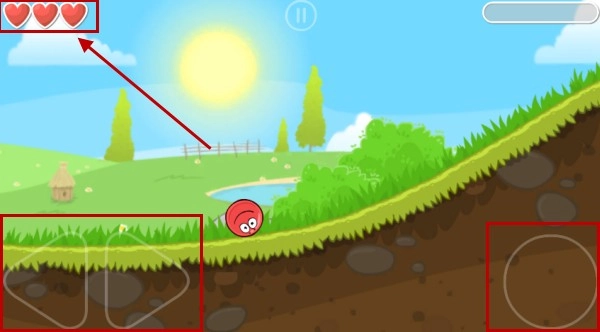 4、屏幕左下角的按键可以用来控制我们小球的移动方向,右侧按键为跳跃按键,屏幕左上角为小球的生命值,开始冒险吧。