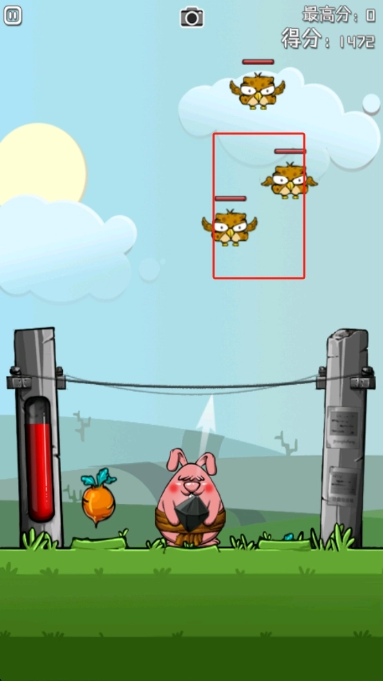 2、战斗过程中,紧盯空中红框内的猫头鹰敌人,指挥兔子精准射击击落来袭目标,同时留意萝卜状态与左侧血量。