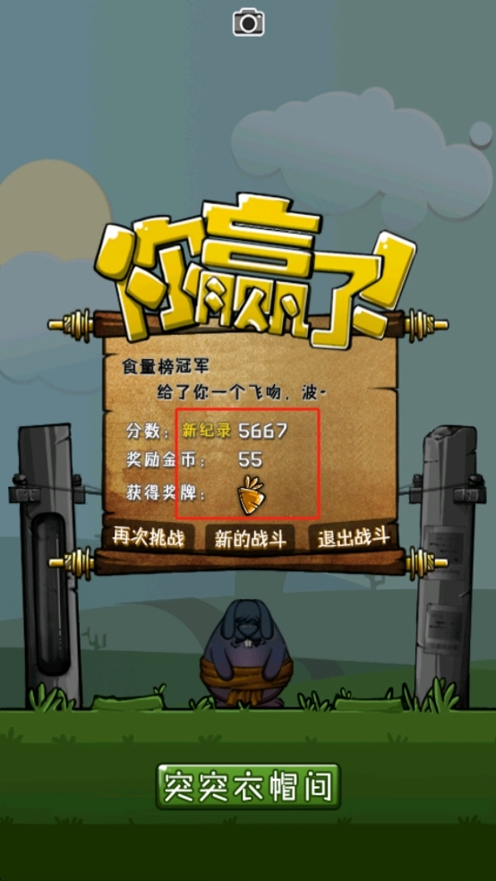 3、战斗胜利后,界面展示新纪录5667分、55枚奖励金币及萝卜形状奖牌,可选择再次挑战突破分数。