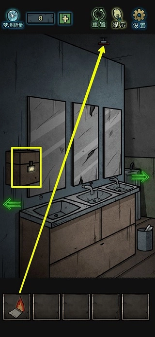 8、镜子上拾取玻璃碎片,洗手台里一个梦境能量;打开没上锁的柜子,获得扳手和半个碎片;