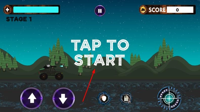 1、启动游戏,在初始界面点击“TAP TO START”开始游戏,进入游戏场景后,点击屏幕左下角的向上箭头按钮,以此控制吉普车向前行驶。