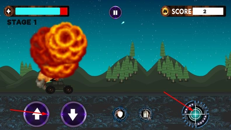 2、在前进过程中,会遇到各种危险,点击右下角瞄准镜的按钮,进行攻击,抵御危险,屏幕右上角分数会随着攻击成功而增加。