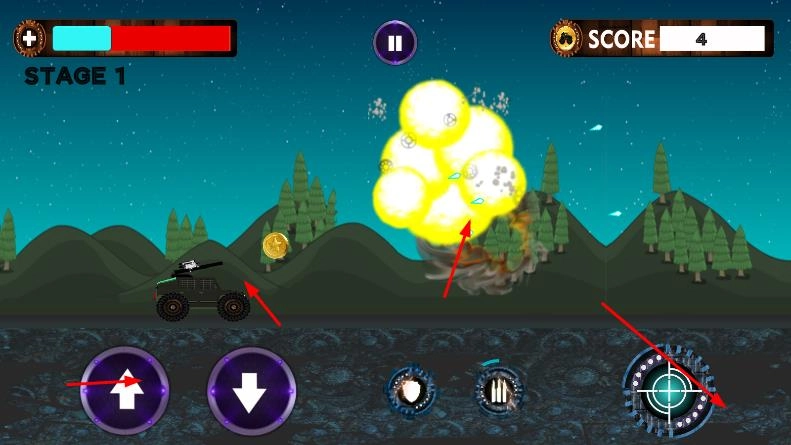 3、持续操控吉普车躲避危险,同时进行攻击防御,尽可能收集路上的金币等道具,顺利通过当前关卡,前往下一关继续挑战。