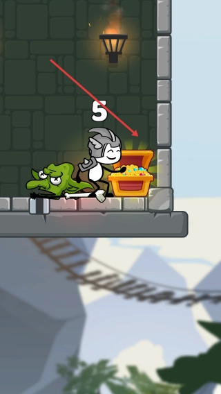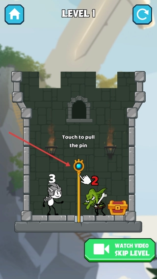 1、仔细观察Level1场景的布局,留意英雄、怪物和宝箱的具体位置,从中找到标有“Touch to pull the pin”字样的金色销钉。