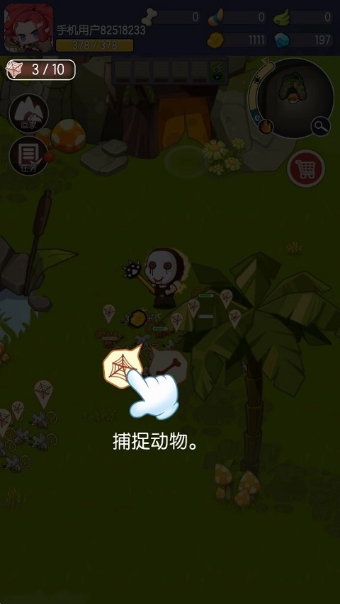 5、进入关卡后,小野人会自动攻击范围内的怪物,通过虚拟摇杆的操控方式,移动小野人避免被大量的怪物包围。期间,如果出现图中所示的图标,则证明此刻可以捕捉动物。