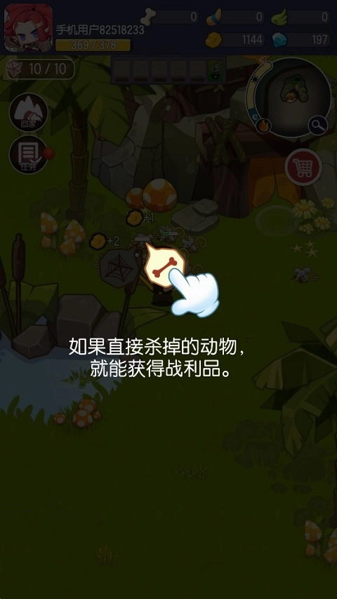 反之,当屏幕上出现「骨头」图标,可以直接杀掉动物,杀掉后就能获得战利品。