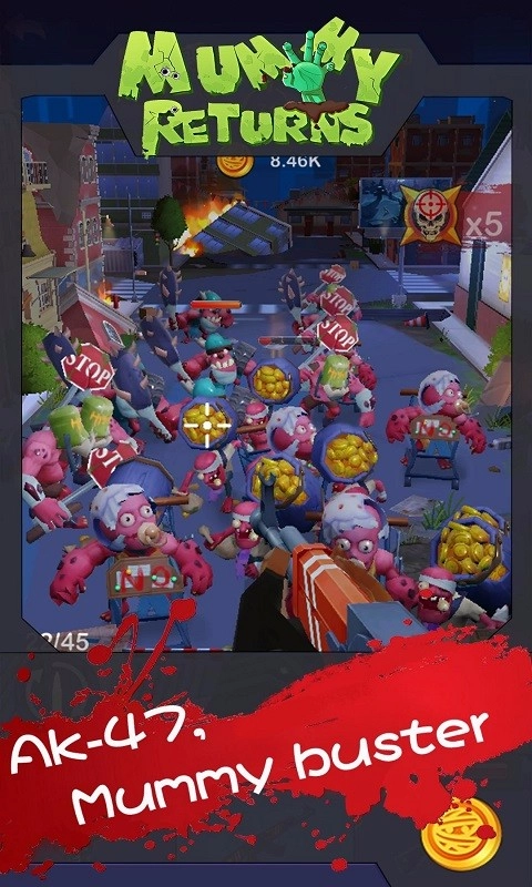 4、游戏中收录了大量真实的武器,雷、霰弹枪、狙击枪、步枪、手枪等种类,ak-47、沙漠之鹰等等经典的武器也收录在内,玩家可以针对不同种类的木乃伊来选择武器射击。