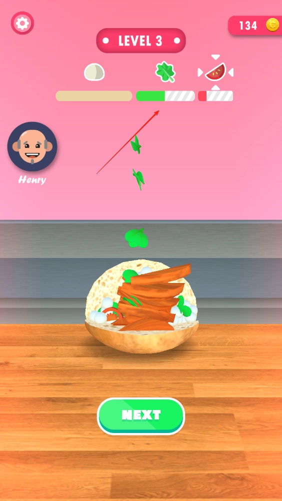2、上方显示顾客对配料的要求及数量,长按即可落下食材,看着进度条及时松手避免放多,且进入下一项食材的摆放。