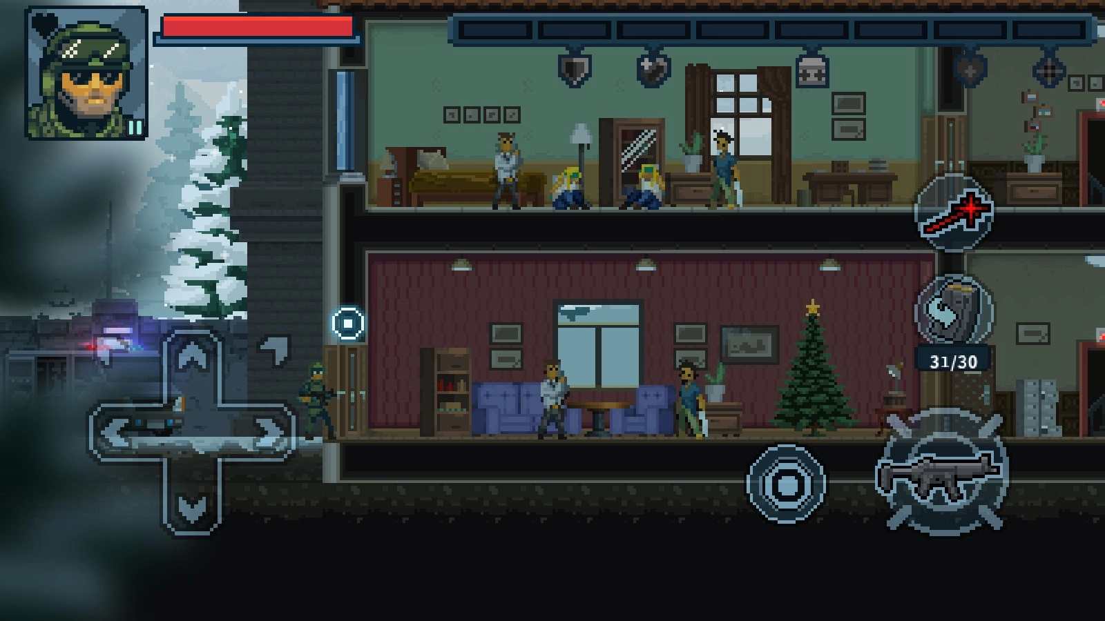 破门而入行动小队汉化版是一款城市反恐题材的2D动作战术射击游戏,着重考验玩家的策略规划能力、实时战斗技巧与高自由度战术设计思维。玩家将化身特警队员,完成解救人质、拆除炸弹、击毙恐怖分子等各类任务。游戏中,你可以精密部署战术,灵活调整应对突发状况,沉浸式体验超真实的近距离作战射击场景。此外,游戏包含数十个不同关卡与数十种武器供玩家选择,助力你更出色地完成战斗任务。