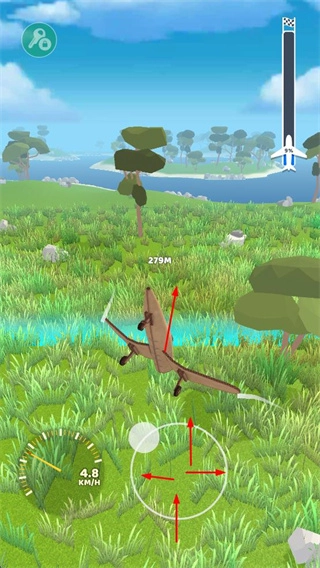 4、在飞行过程中,操控飞机调整方向和高度,探索不同区域,朝着更远飞行距离和更高分数的目标努力。