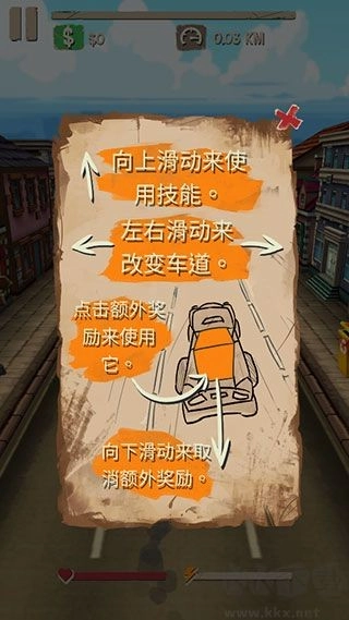 3、掌握操控方式:进入场景,通过左右滑动变换车道,上滑操作使用技能。
