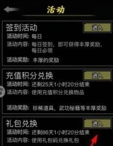 1、在这就是江湖“活动”界面的第三行可以发现“礼包兑换”的字样,点击对应方框右边的“进入”。
