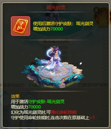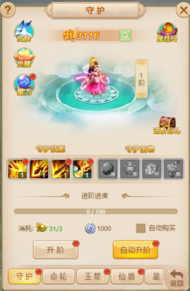 守护拥有四个技能,分别是:守护、命轮、玉辇和仙盾,可以通过技能书去强化技能。