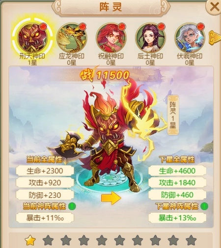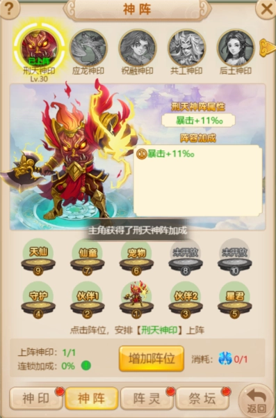 当神印达到一星以后就可以放置到不同的神阵上,提升单位的属性哦