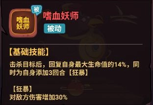 大鹏金翅雕作为战士,天妖血脉的被动可以给它带来不错的血量以及攻击提升。也其具备一定伤害的同时也有站场的能力。基础技能大鹏展翅可以攻击两个生命最少的攻击目标并且施加流血效果,不仅对流血目标后续有增伤还有减治疗的效果,更是可以在击杀目标后回复自身最大生命值并且增加自身狂暴状态强化伤害进一步增强后续作战能力。