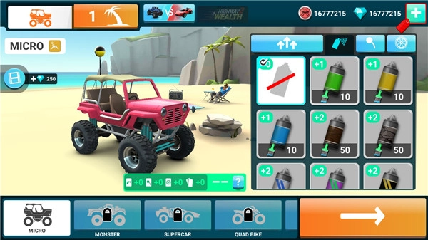 3、升级你的车,更换更大的轮胎,提高你的速度和获得更多的抓地力。