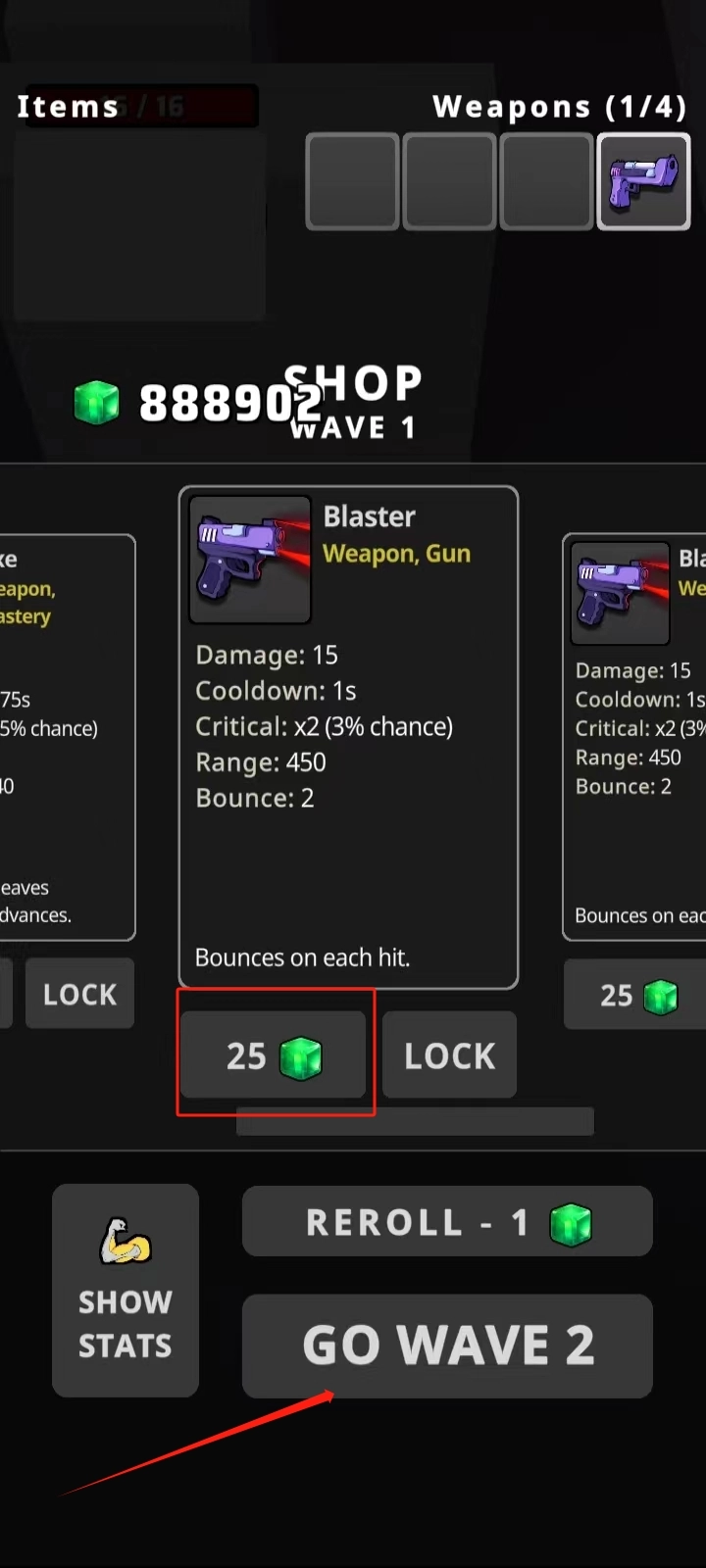 6、使用绿色的晶体购买武器,然后进入下一波战斗。