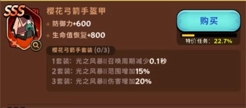 第二套推荐的是 樱花弓箭手套装,这个套装同样也是属于sss级别,附带的套装属性有增加范围和伤害、减少召唤周期的作用,在敌人数量多的时候可以使用这个套装,清线速度巨快,详细的可以点开装备查看