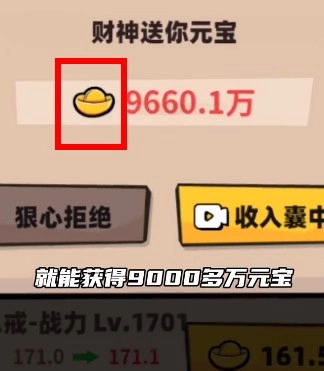 在喜迎财神助力页面,连续点击这个元宝10下就能获得9000多万元宝