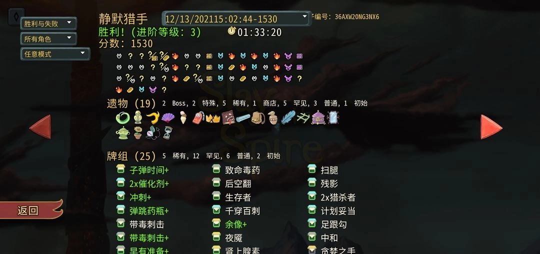 简单说下流程:一层拿两张带毒刺击,boss拿子弹时间和皇冠。余像、后空翻、冲刺、残影配合遗物折扇用来叠甲,早有准备、猎杀者用来过牌。
