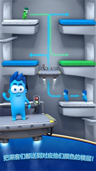 4、上下划动来移动电梯。 搭载乘客,在其爆炸之前,将其送达与其颜色相符的楼层。