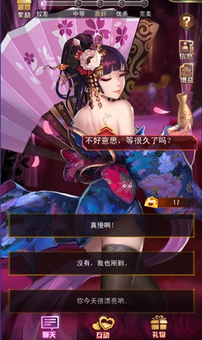2、聊天功能开动脑筋想象一下女神是什么类型来回答女神的问题,评论得分越高增加的好感度也越高,与女神聊天需要亲密卡,亲密卡消耗完了记得去商城补充!