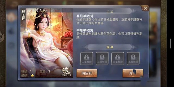 杨玉环的羞花技能和貂蝉的闭月有几分类似,全都是减血能够拿牌,杨玉环星级同样是相当难的没几个人有星级杨玉环,因此在宝具场的表现并不大,然而在经典局宁神同样是1个T1其余英雄,有着较强的容错力量,有一个丰艳技能在同伴抑或对手有判断牌时白白的拿牌,偶尔是1个救命稻草。