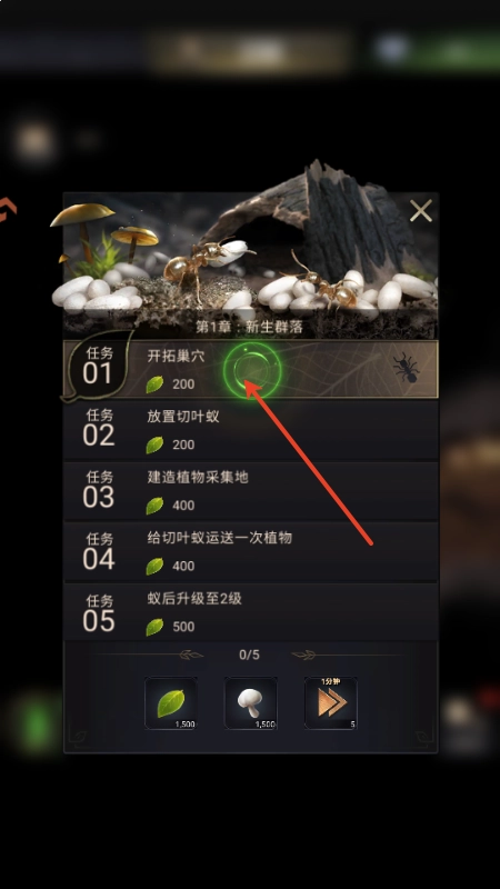 蚁巢地区限制条件:想要探索除去自己等级之外的更多蚁巢位置,就必须将蚁后的等级提升,而蚁后想要提升等级,就转化成了各种资源的获取以及仓库储存限制。这两个条件是相互转换的,说白了,想解锁更多的区域,你就得有这么多的物资。而新手引导结束之后,玩家们的主要目标也应该变成想法提高蚁后的等级,这样主要任务就转化成为尽可能多的在游戏中获取肉,水,植物,沙子,蜜露等种种资源。