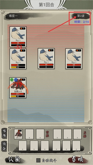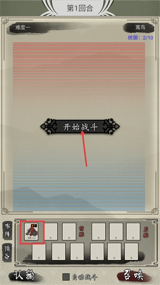 1、进入【第1回合】-难度一界面,确认【统御:2/10】以及已布阵的【当康Lv0】,点击【开始战斗】按钮开启对局。