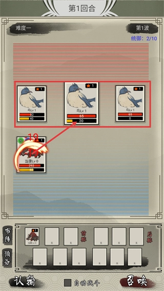 2、【第1回合】-第1波对战中,敌方为3个【鸟Lv1】,操控【当康Lv0】攻击,留意敌方血量变化推进战斗。