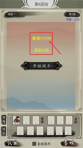 3、【第6回合】-第2波前,可获取【兽魂+2100】与【灵石+55】奖励,确认后点击【开始战斗】进入下一波。