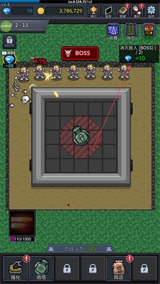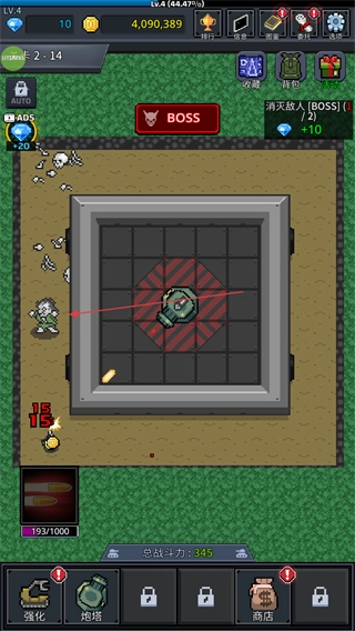 4、不断消灭敌人和BOSS,推进关卡进度,同时利用获得的资源强化炮塔,应对更强大的敌人。