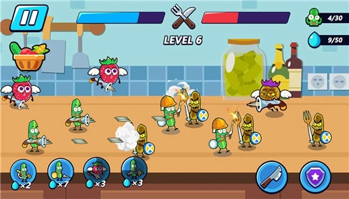 3.只要完成通关任务就能够解锁更多的蔬菜角色,快速增加更多的新兵种。