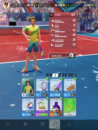 3.自由搭配球拍、护腕、球鞋、球包等装备,让选手的属性全面强化。