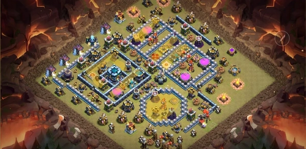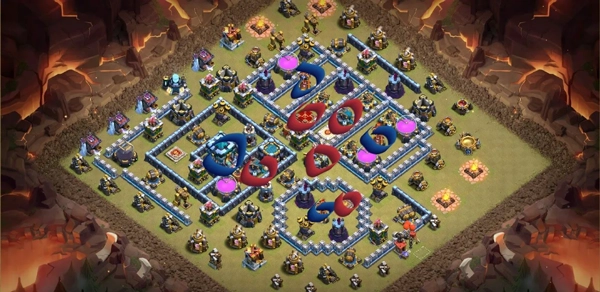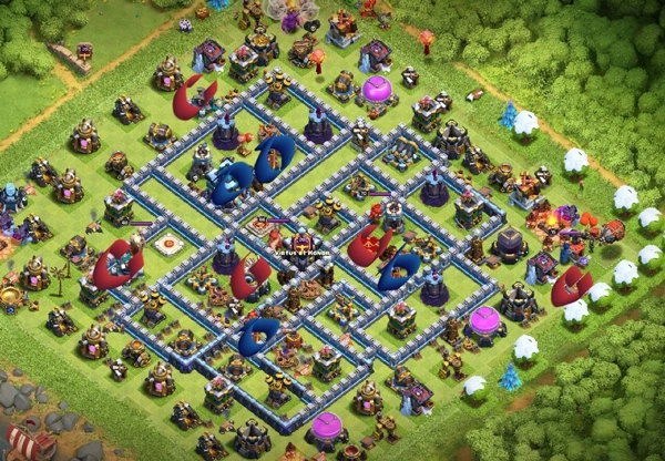 设计地狱塔隔断区域时,你应该考虑以下几点:部队路线、大气球路线、女王能不能打到,还有上边说过的“合理摆放核心防御”。