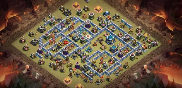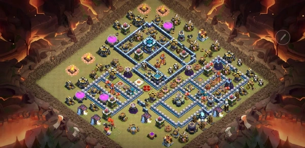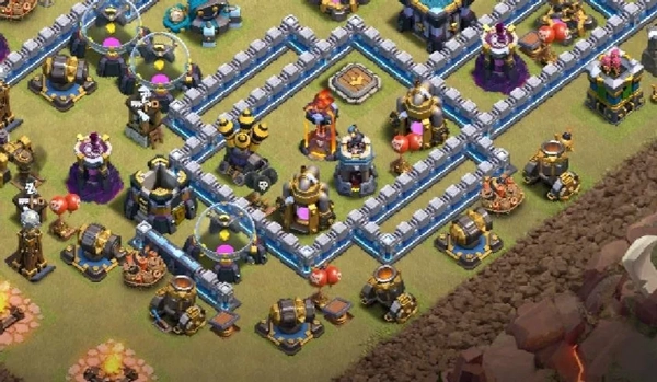 在这种布局下,大气球、闰土以及攻击偏好为防御的兵种不能轻易去打地狱塔,而是先绕地狱塔走一圈,所以地狱塔可以充分输出。