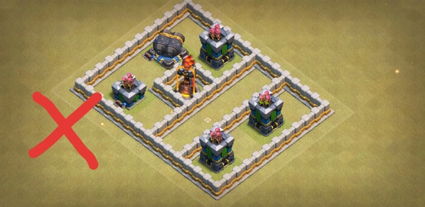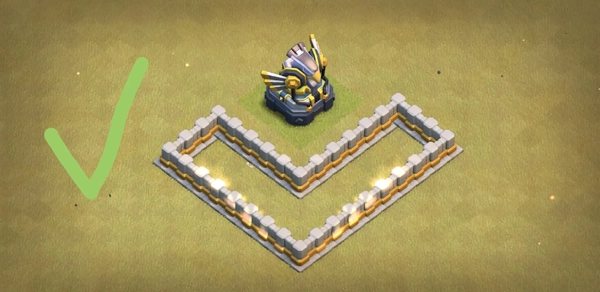 你应该时刻考虑部队的走位,你想让他们去哪儿,你就尽力把部队引导到哪儿。做阵时,最好能让气球、猪、大气球都难以打到地狱塔。为了达到这个目的,你需要在地狱塔周围放几个防御建筑,就像这样: