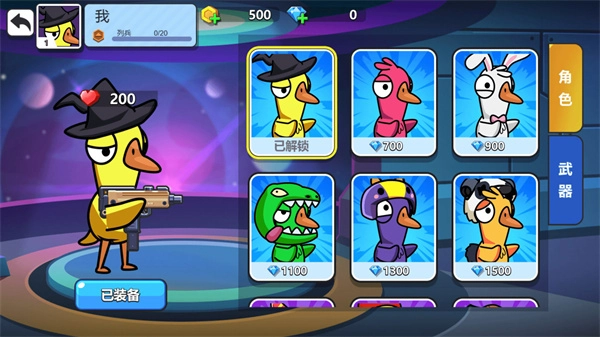 这是一款十分生动的动作大作战游戏,游戏中的鹅和鸭角色拥有丰富多样的外貌和形象,像恐龙睡衣鹅、兔子鹅、熊猫鹅、绅士鹅等,每一种都能解锁获取。此外,游戏还提供了众多武器和玩法模式。为了赢得胜利,玩家需要获取更强大的武器,并对其进行强化,以便更好地进入游戏与对手作战。