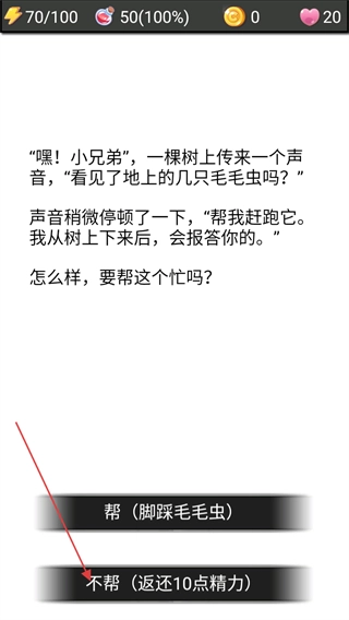 4、继续进行流浪探索,触发新的剧情故事,选择不帮则可以恢复精力值。