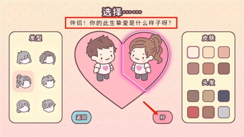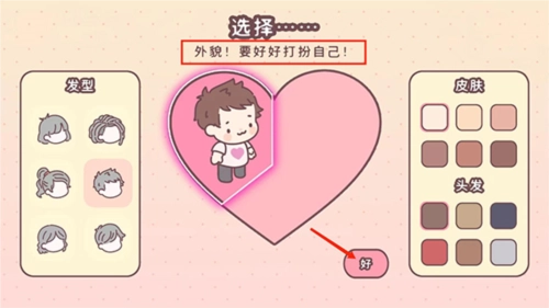 1、打开袋中的爱游戏,进入角色DIY界面,挑选自己心仪的发型、皮肤与头发,之后选择【好】选项。