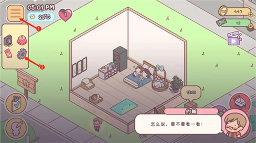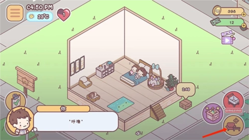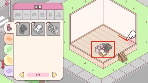 4、进入游戏主界面按照提示,拖动盆栽、沙发和柜子,移动到指定的位置,完成新手任务后,就是自己来布置这个有爱的小家了,